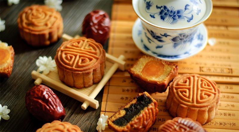 Обязательное лакомство на Праздник середины осени — лунные пряники юэбины. Это небольшие золотистые печенья (обычно не более 10 см в диаметре и 5 см в толщину), сделанные в форме круга, а иногда — квадрата или ромба с закруглёнными краями. Сверху у такого пряника — тонкое рассыпчатое тесто, а внутри — шарик начинки, обычно сладкой. Печенья бывают очень нежные и буквально тают во рту.