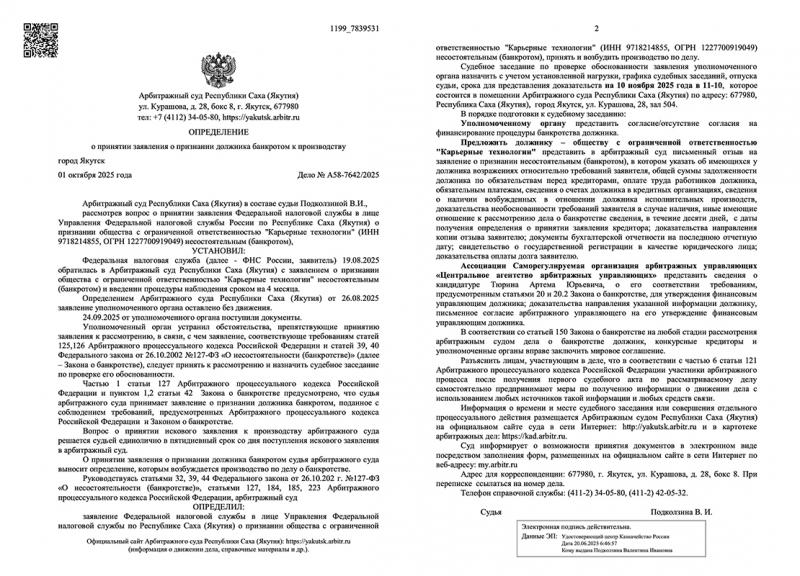 В период проведения СВО и огромной нужды в пополнении бюджета РФ компании экс-министра Ангаева Б.Д. ООО «Карьерные технологии» умышленно не платят налоги в бюджет РФ и Якутии в крупном размере 17 миллионов рублей. Долг перед бюджетом не погашен до настоящего времени, о чем свидетельствует картотека арбитражных судов. Арбитражный суд Якутии принял заявление налоговой о признании ООО «Карьерные технологии» банкротом и открыл производство по делу (дело № А58-7642/2025).