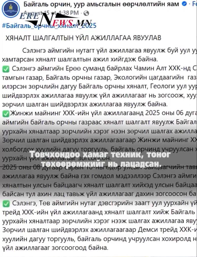 Министерство окружающей среды Монголии в августе текущего года подтвердило, что в аймаке Сэлэнгэ проводятся масштабные инспекционные мероприятия в отношении нескольких горнодобывающих компаний. По данным ведомства, в июне и июле проходили проверки экологических организаций и органов геологии, в ходе которых были выявлены нарушения при эксплуатации лицензионных участков. Деятельность таких компаний была приостановлена на основании решений инспекционных комиссий, также открыты дела и проводятся расследования, по результатам которых министерство обещает применить штрафные санкции и взыскать ущерб, нанесённый окружающей среде.
