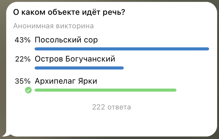 Телеграм-канал «Бурятия. Бабр. Дальше некуда» спросил читателей, о каком объекте идёт речь. Большинство ошибочно предположило, что это Посольский сор, однако 35 % опрошенных узнали в описании архипелаг Ярки.